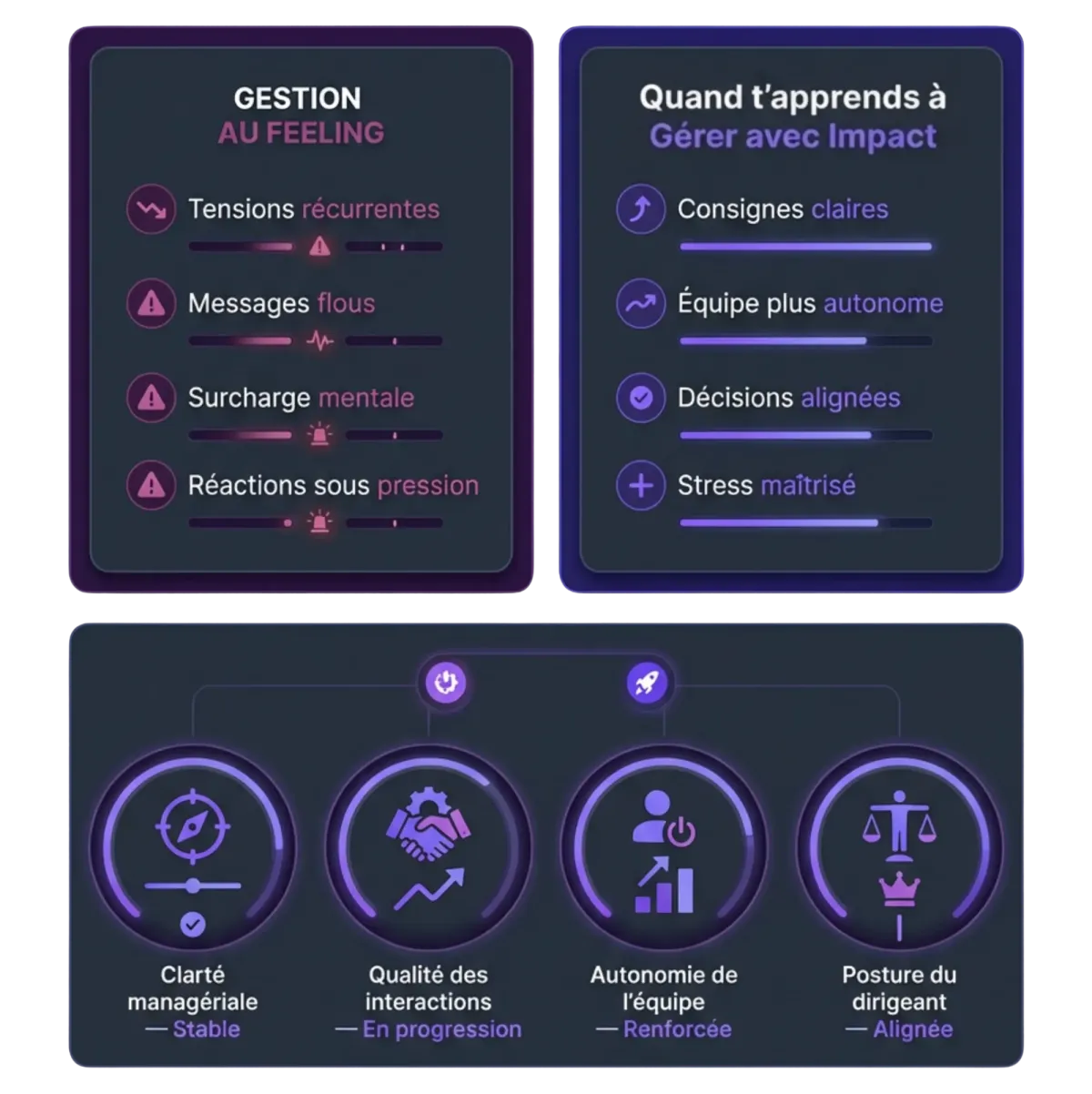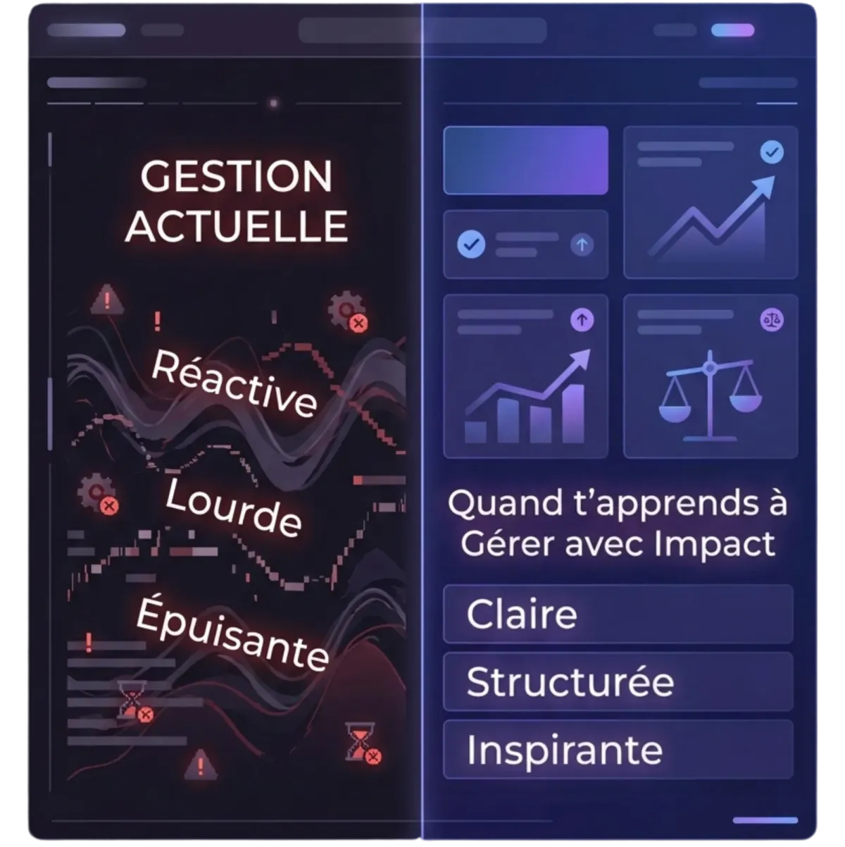 Un parcours hybride (formation + coaching) conçu pour les dirigeants surchargés qui veulent moins de chaos, plus de clarté et une équipe plus autonome, rapidement.